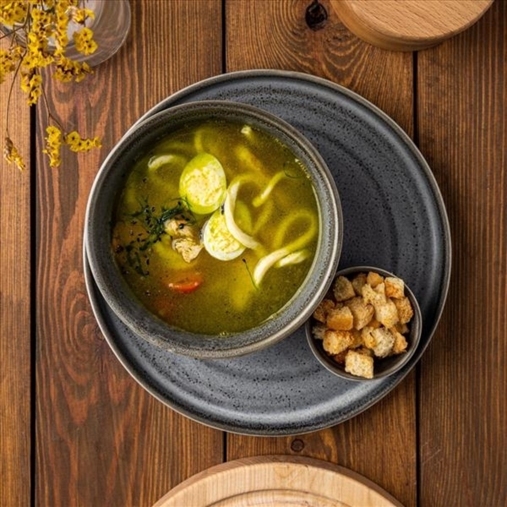 Куриный бульон, куриное филе жареное, морковь, лапша домашняя, перепелиное яйцо, черри, сухарики.