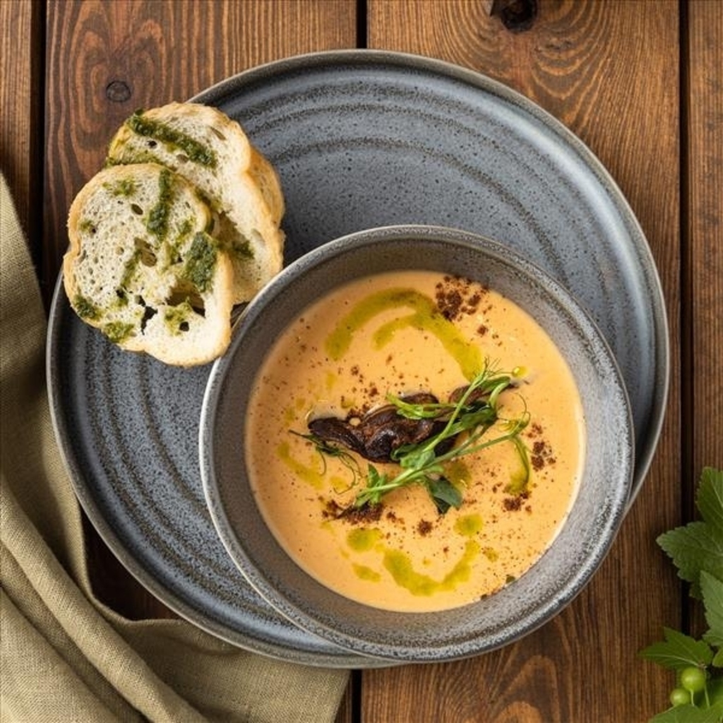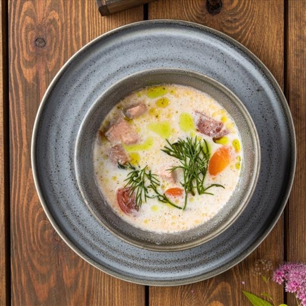 Крем-суп из картофеля, бекона, копченой курицы со сливками.