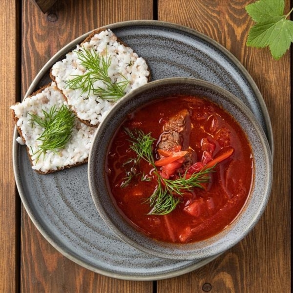 Говядина, картофель, лук, морковь, томатная паста, чеснок, капуста свежая, капуста квашенная, свекла, говяжий бульон. Подается с бородинским хлебом, намазанным перекрученным салом с чесноком.