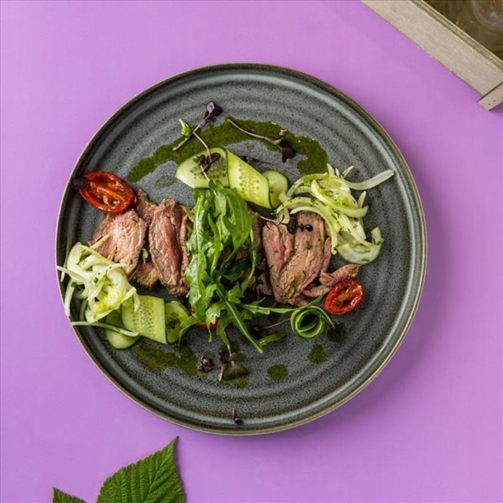 Ростбиф, томаты черри вяленые, огурцы свежие, лук репчатый, соус.